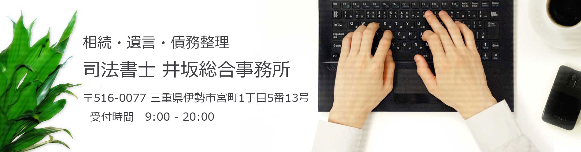 お知らせ 令和7年 伊勢のお店応援商品券2025年9月11日 公式ライン始めました2024年1月6日 年末年始の営業日2023年11月22日 伊勢のお店応援商品券2023年11月8日 相続プラスさんに掲載されました。2023年11月5日 司法書士 井坂総合事務所 代表井坂圭吾より 当事務所のウェブサイトをご覧いただきありがとうございます。 私は、平成23年に司法書士に登録し、三重県内の事務所で経験を積んできました。 平成27年に、地元である伊勢市の皆様のお役に立ちたいと思い、独立開業いたしました。 代表挨拶ページへ 取扱内容 司法書士 井坂総合事務所の取扱内容は以下のようになります。 不動産登記当事務所で取り扱う不動産登記をご紹介します。 商業登記当事務所で取り扱う商業登記をご紹介します。 債務整理当事務所で取り扱う債務整理をご紹介します。 過払い金請求当事務所で取り扱う過払い金請求をご紹介します。 相続・遺言当事務所で取り扱う相続・遺言をご紹介します。 裁判当事務所で取り扱う裁判をご紹介します。 記事一覧 代表取締役の住所非表示措置が開始2024年10月2日 金融資産の遺産承継2024年8月29日 過払い金請求2017年7月7日 ブラックリストとは2017年7月7日 株式会社設立の登録免許税の減額の特例 15万円→7.5万円2017年7月3日